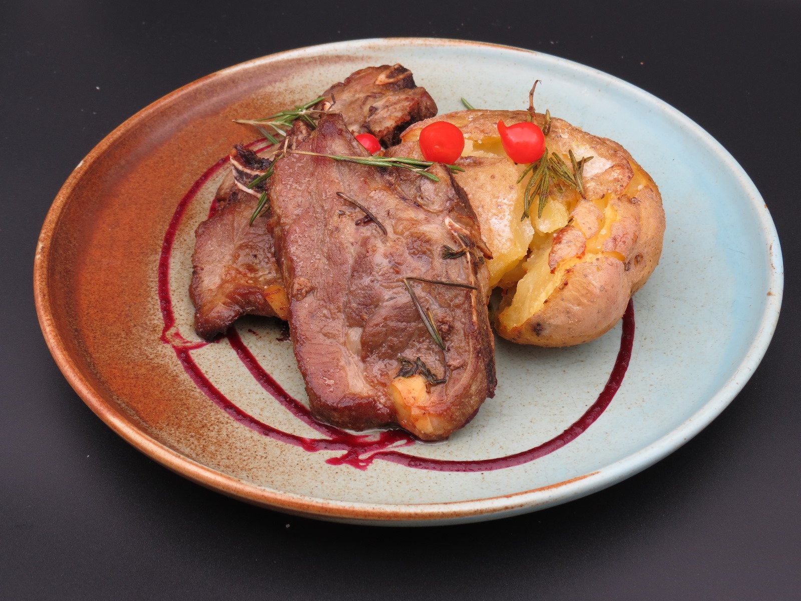 Acesta este acompaniat de cartofi zdrobiți, preparați cu unt, vin, usturoi și cimbrișor. Cartofii sunt gătiti până devin moi și apoi zdrobiți, adăugând unt și vin pentru o consistență cremoasă și un gust intens, îmbogățit de aromele subtile ale usturoiului și cimbrișorului.